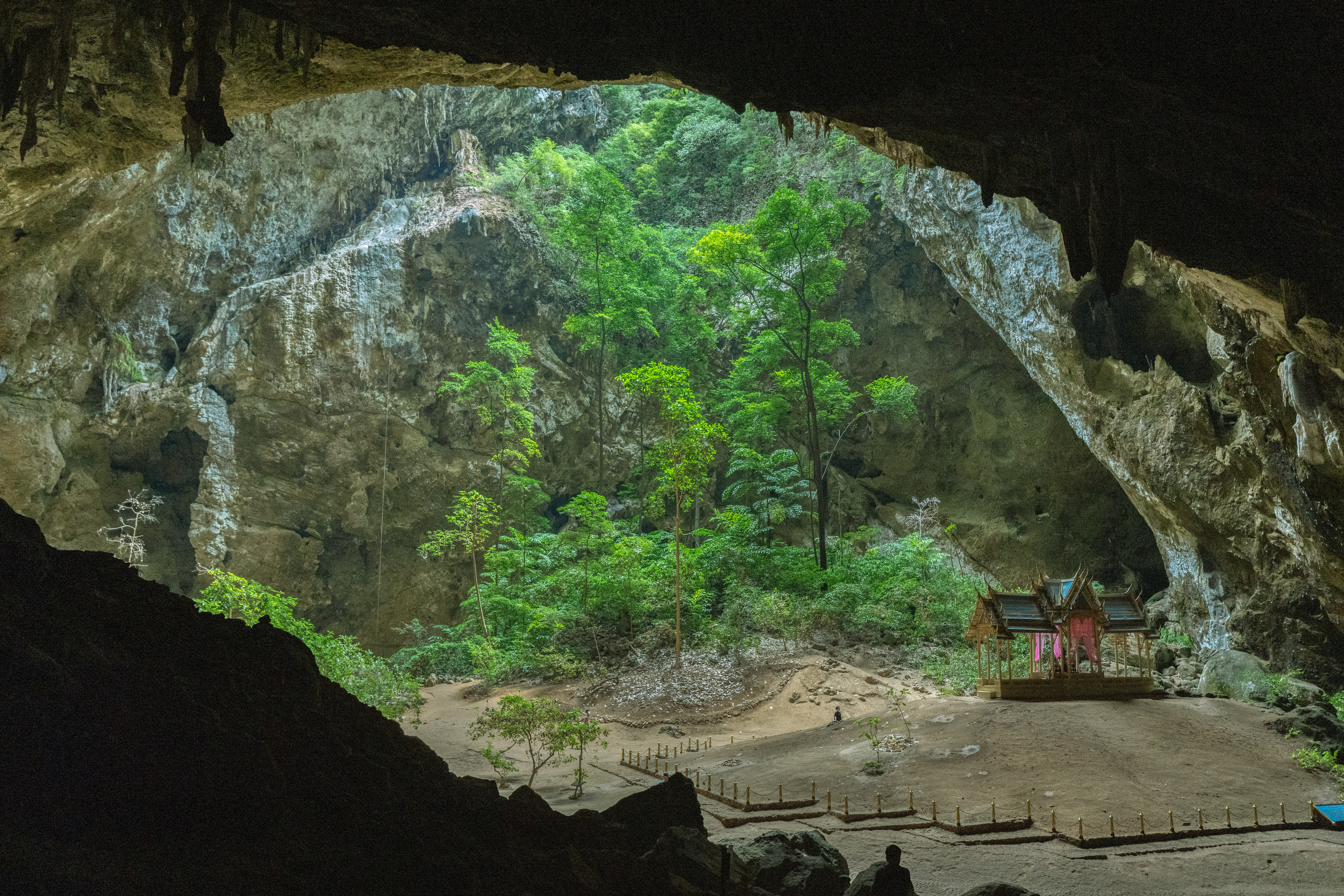 동굴의 중앙에는 큰 구멍이 있어 자연광이 들어오는데, 그 빛이 동굴 내부를 환상적으로 비추고 있어요. 이곳에 있는 **왕실 정자(Khuha Kharuehat Pavilion)**는 태국 왕족을 위해 지어진 건축물로, 역사의 흔적과 자연의 신비가 공존하는 곳이었어요.